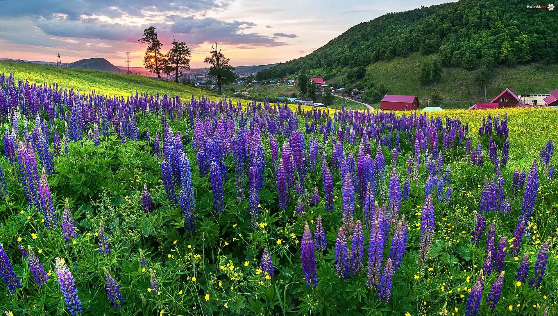 Kwiat Łąka, Wzgórza, Łubin, Domy, Droga, Chmury, Wschód słońca