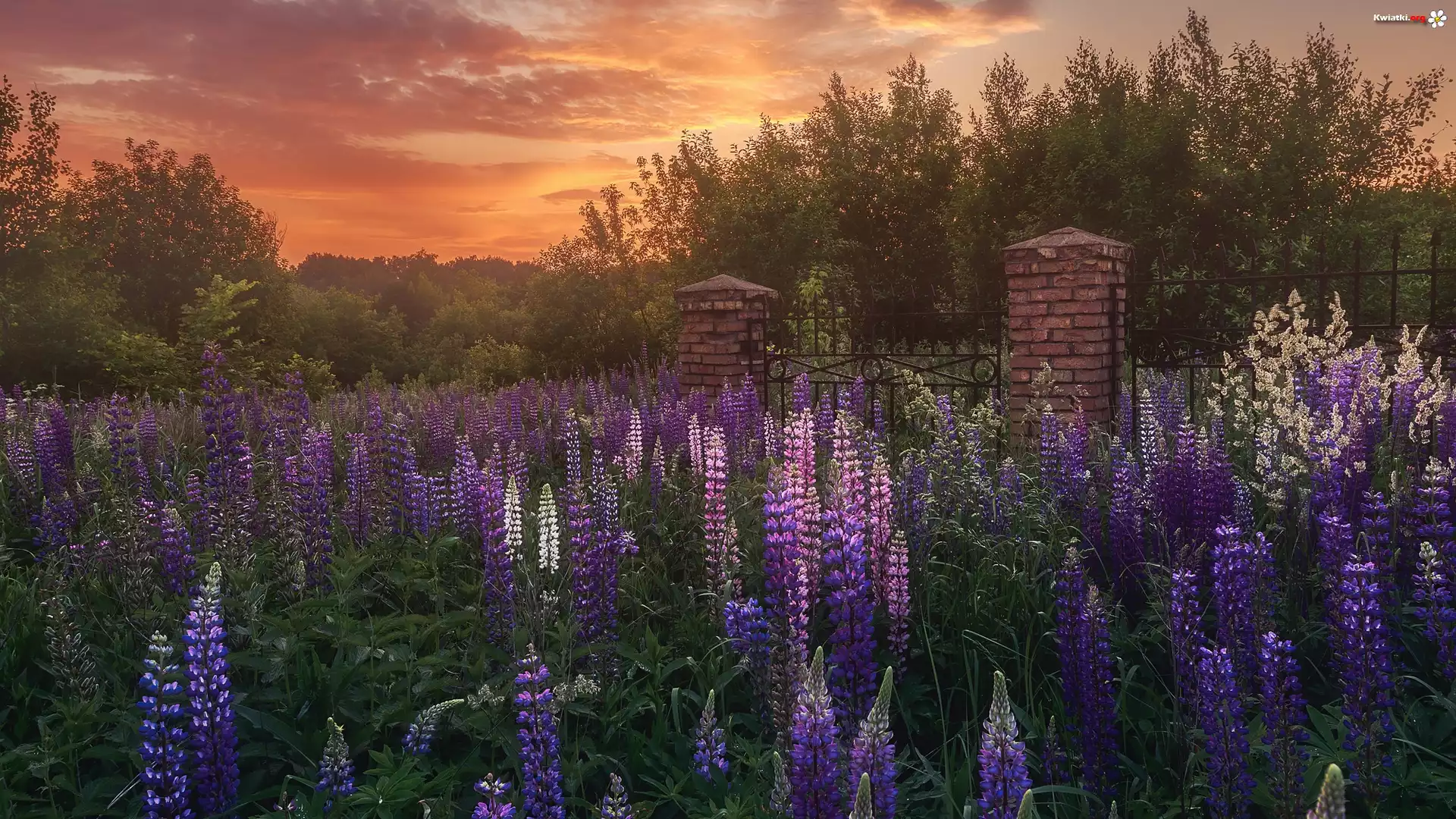 Zachód słońca, Łąka, Kwiaty, Łubin, Ogrodzenie, Drzewa - Zdjęcia