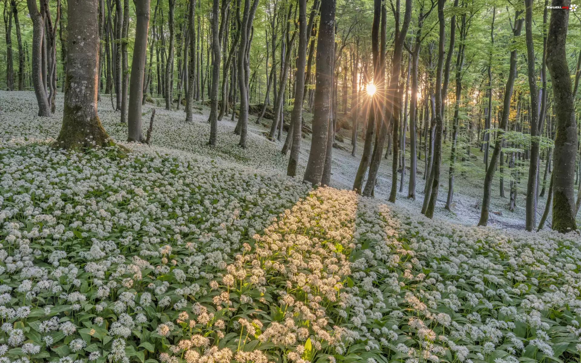 Kwiat Wiosna, Las, Drzewa, Kwiaty, Czosnek niedżwiedzi, Promienie słoneczne