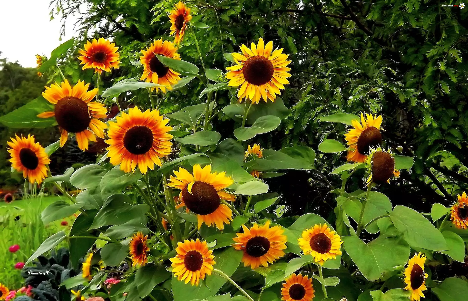 Kwiat Słoneczniki, Drzewa, Liście, Ogród