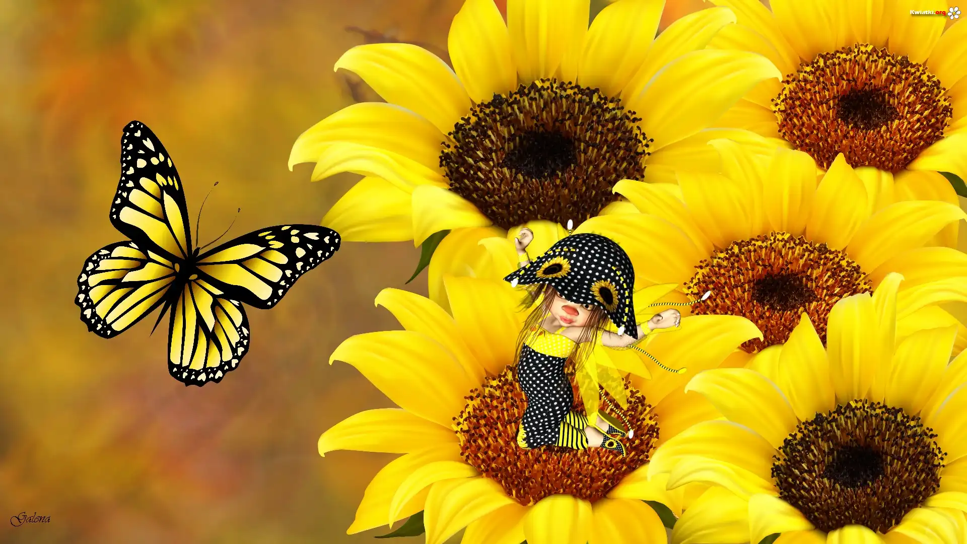 Słoneczniki, Laleczka, Motyl, Grafika - Zdjęcia