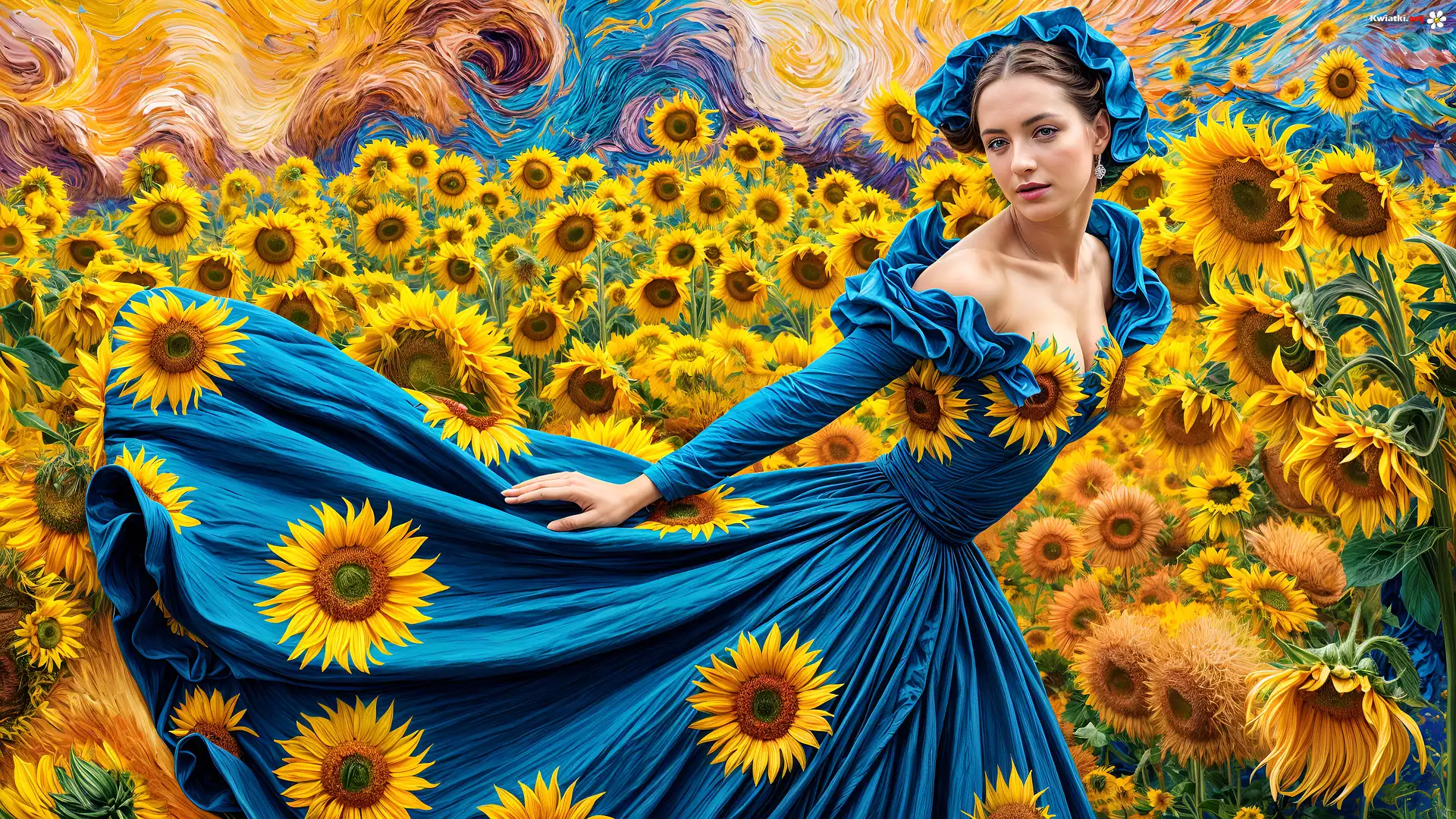 Kobieta, Słoneczniki, Niebieska, Suknia, Grafika - Zdjęcia