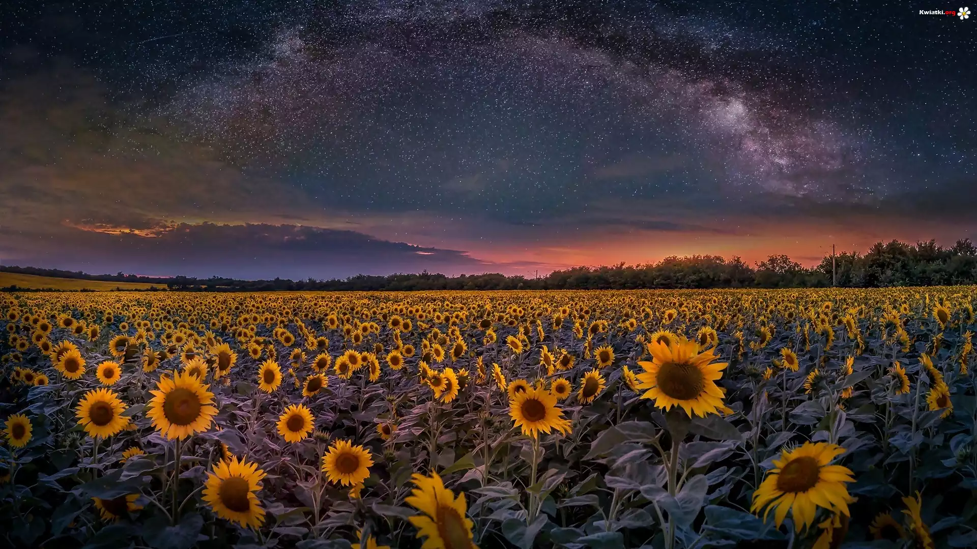 Słoneczniki, Zachód Słońca, Niebo, Gwiazdy - Zdjęcia