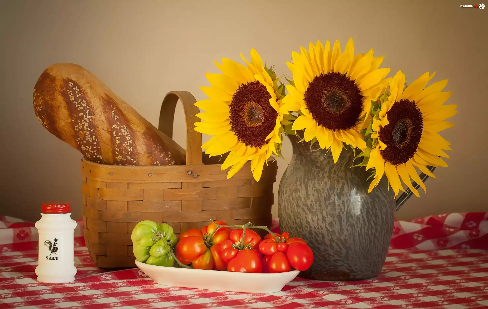 Kompozycja, Słoneczniki, Dzbanek, Chleb, Koszyk, Pomidory, Solniczka, Obrus - Zdjęcia