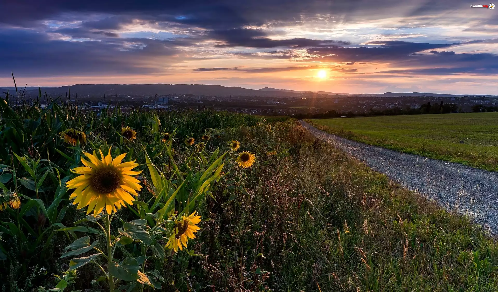 Kwiat Słoneczniki, Pole, Droga, Słońce, Chmury