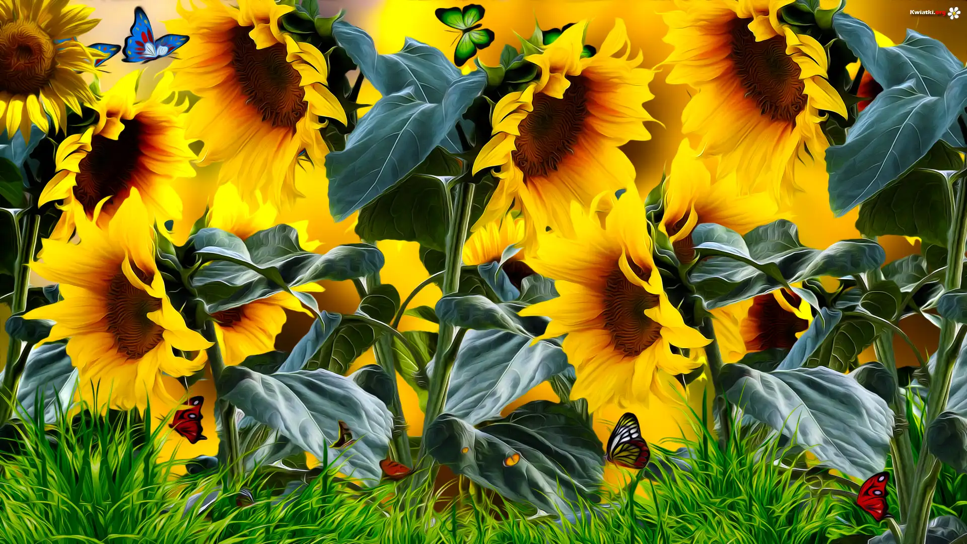 Kwiat Słoneczniki, Motylki, Trawa, Grafika