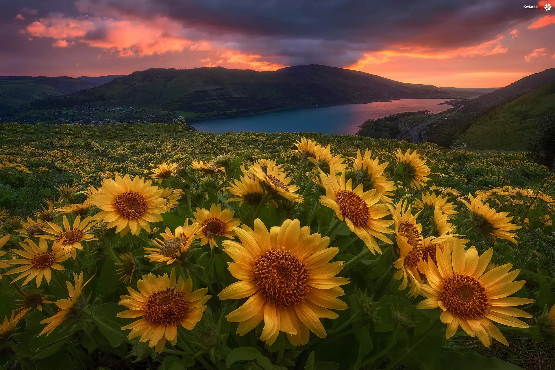 Słoneczniki, Jezioro, Góry, Zachód, Słońca - Zdjęcia