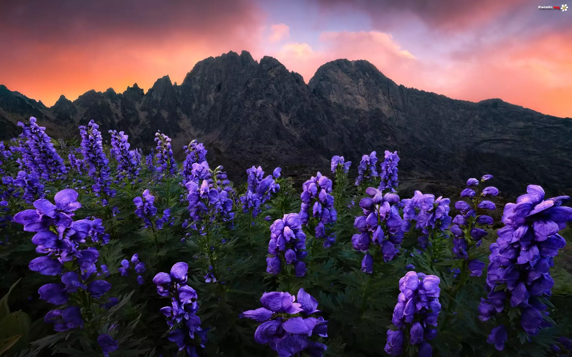 Kwiat Słowacja, Góry, Tatry Wysokie, Kwiaty, Łubin, Zachód słońca, Chmury