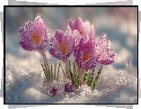 Rozkwitające, Różowe, Krokusy, Śnieg, Grafika AI - Zdjęcia
