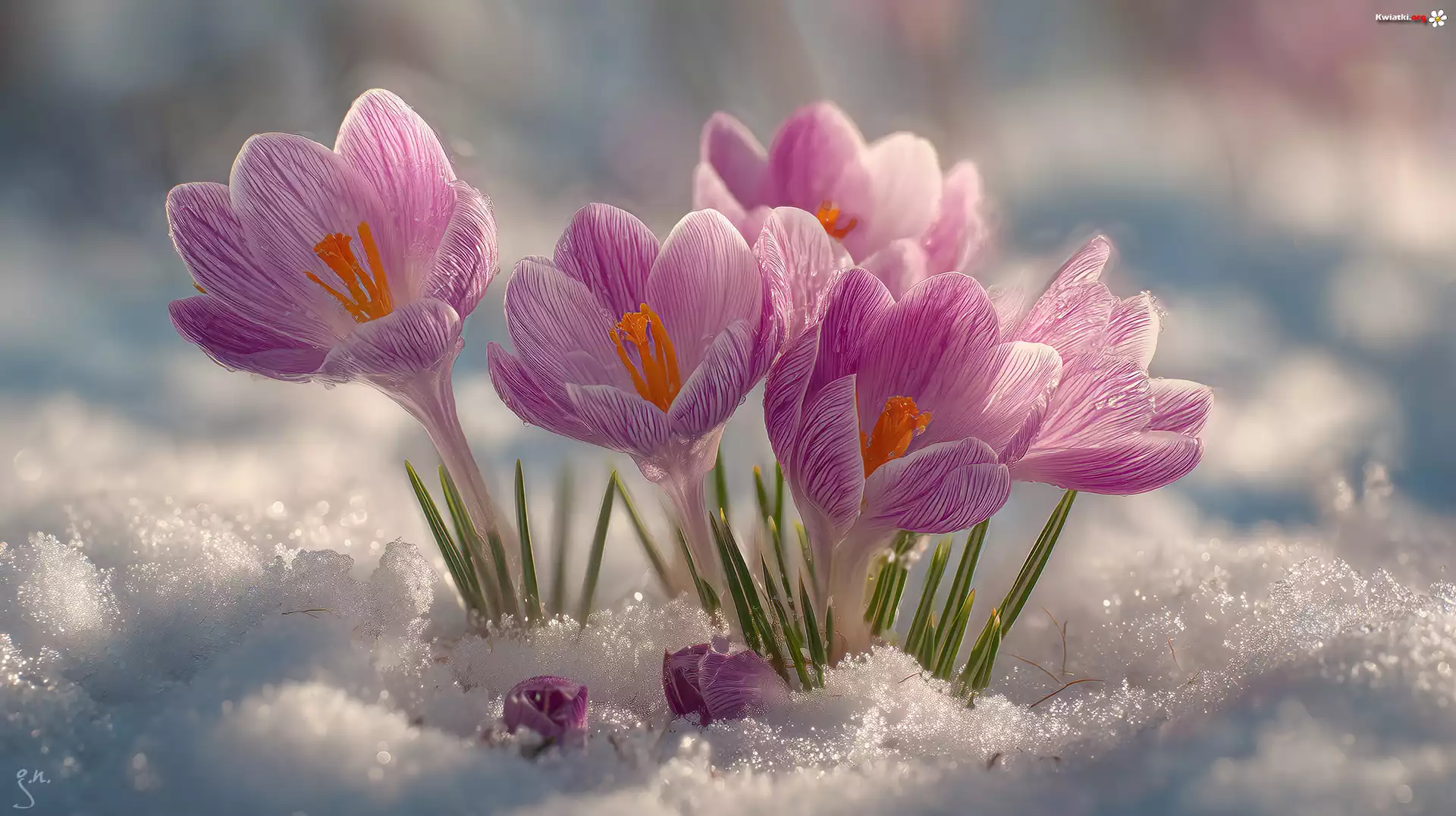 Kwiat Rozkwitające, Różowe, Krokusy, Śnieg, Grafika AI