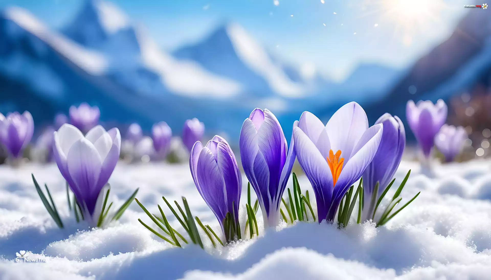 Fioletowe, Krokusy, Kwiaty, Śnieg, Góry, Grafika - Zdjęcia