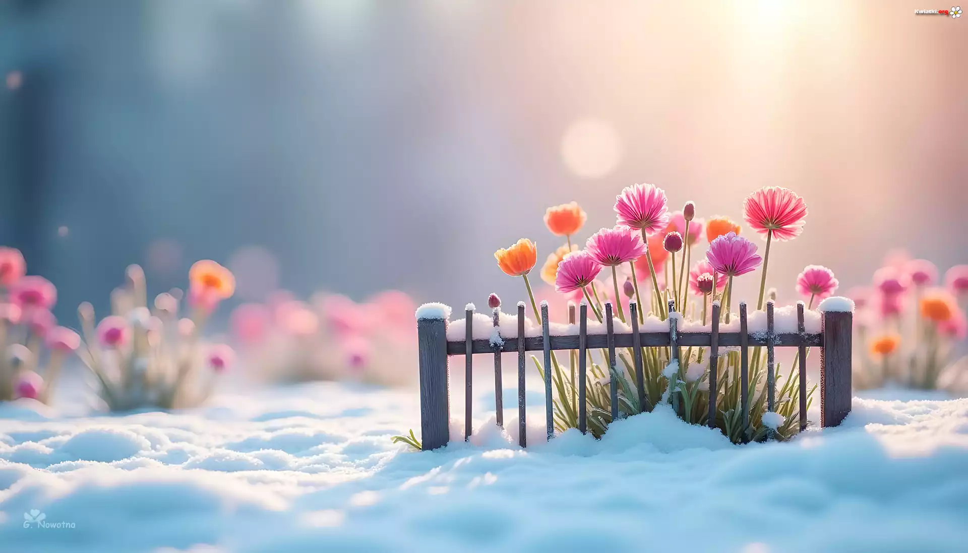 Kolorowe, Kwiaty, Płotek, Śnieg, Zima, Grafika - Zdjęcia