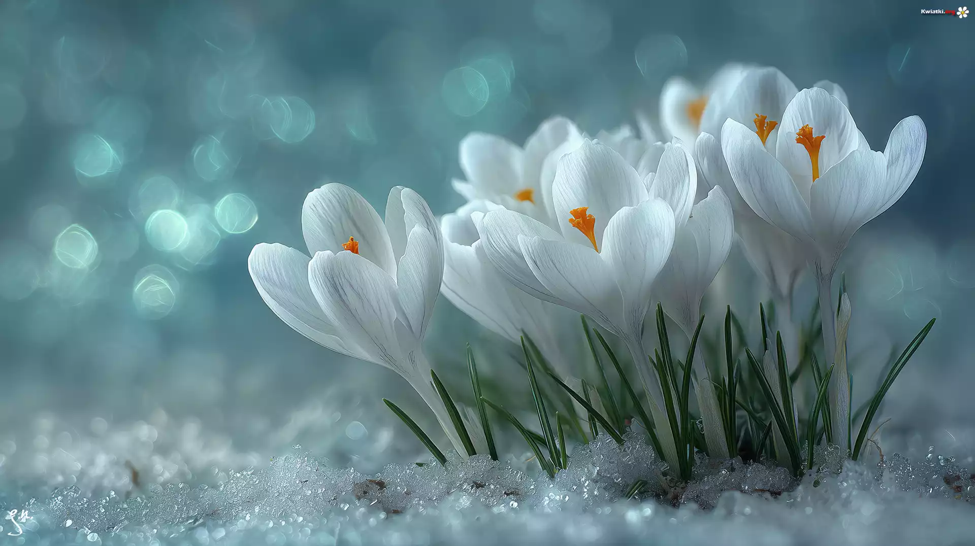 Białe, Krokusy, Kwiaty, Śnieg, Bokeh, Grafika AI - Zdjęcia