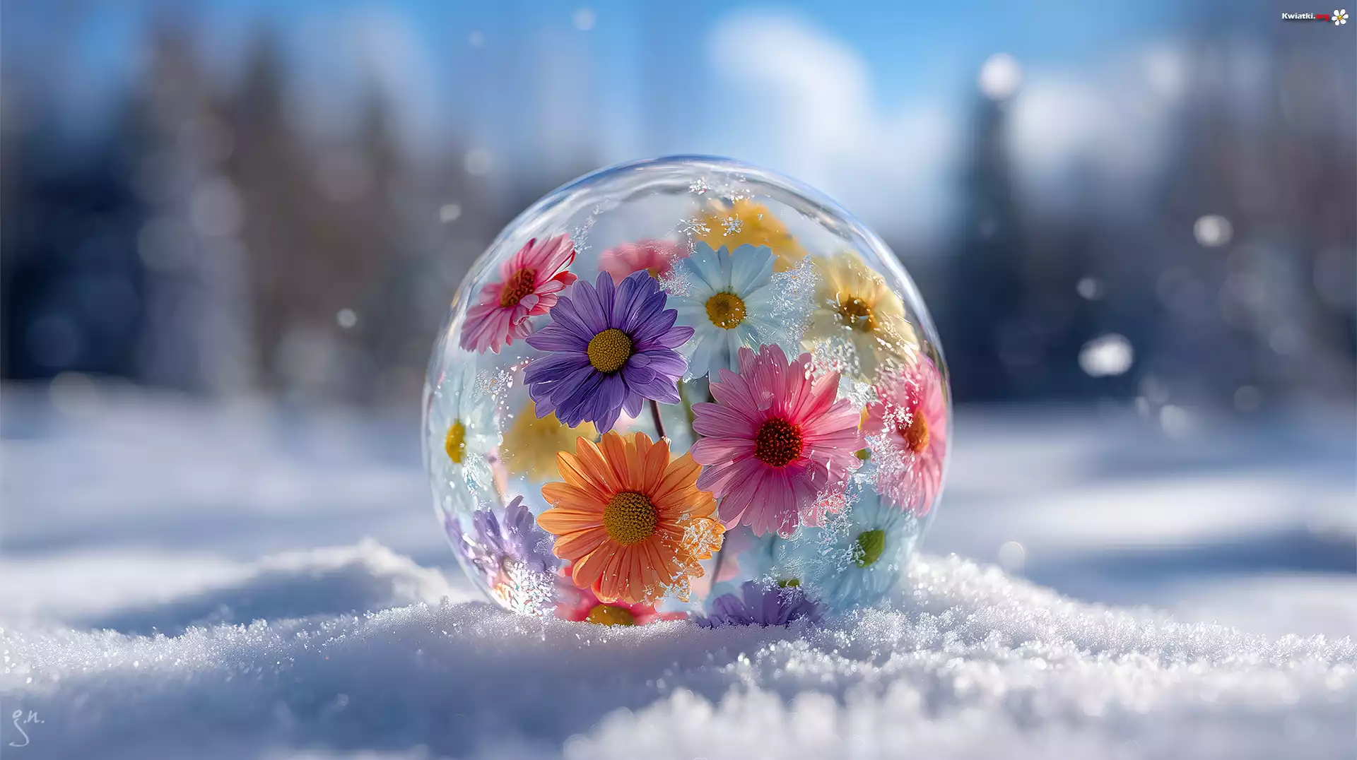 Szklana, Kula, Kwiaty, Śnieg, Zima, Grafika AI - Zdjęcia