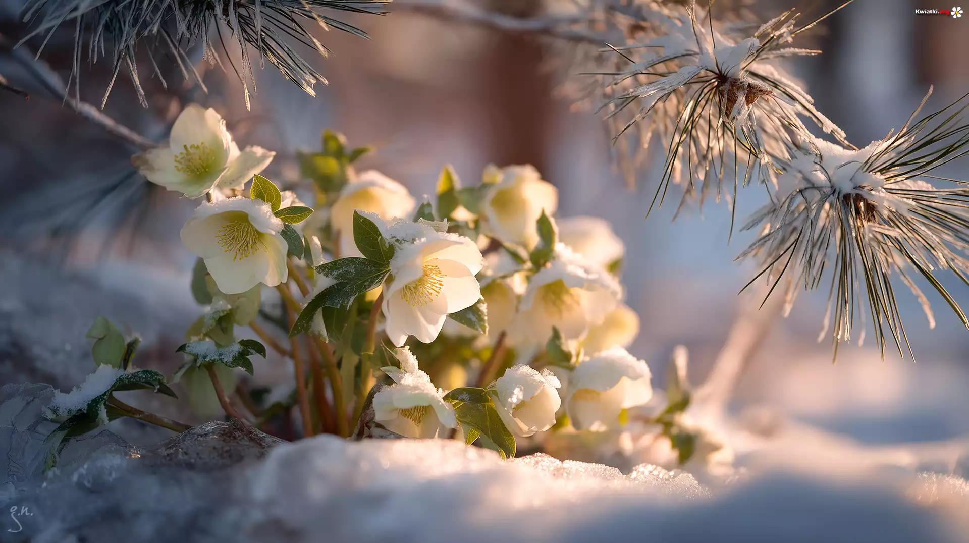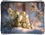 Kwiat Białe, Ciemierniki, Śnieg, Sosna, Grafika AI