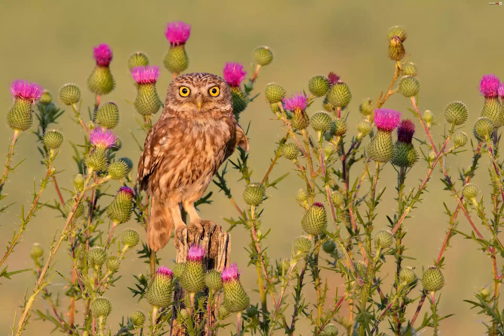 Sowa, Pójdźka, Kwiaty, Oset - Zdjęcia