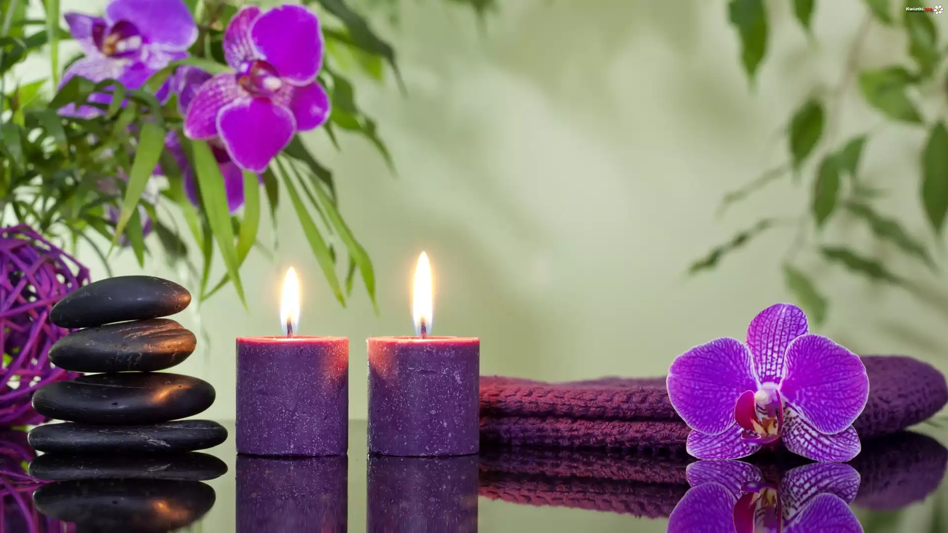 Kwiat Kompozycja, SPA, Fioletowe, Storczyki, Dwie, Świece, Kamienie