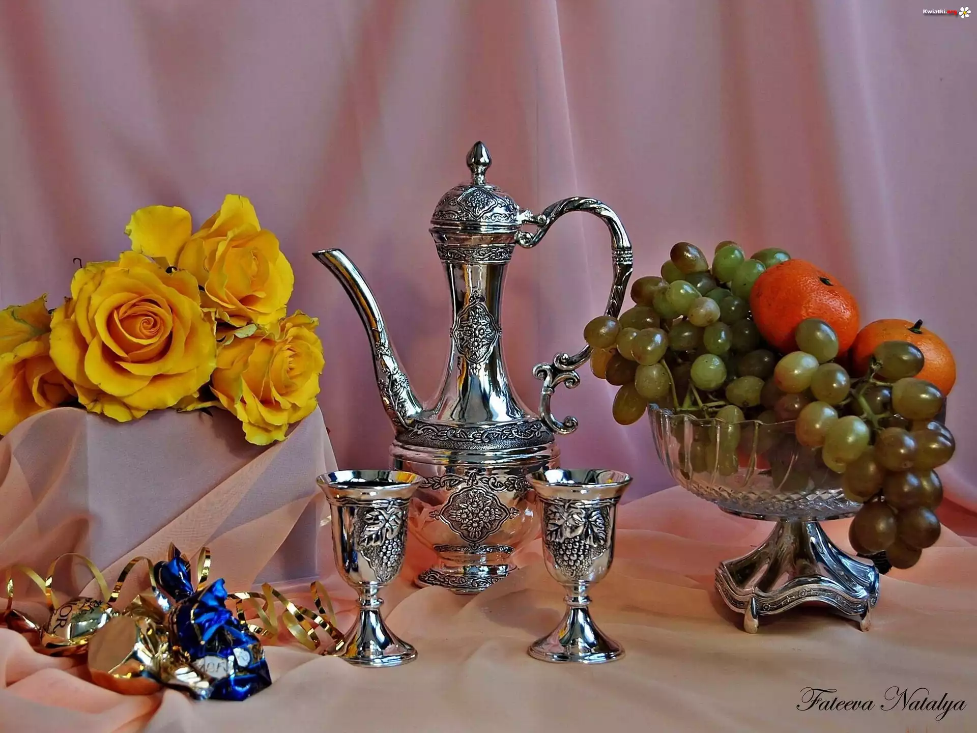 Srebrna, Zastawa, Winogrona, Żółte, Róże, Owoce - Zdjęcia