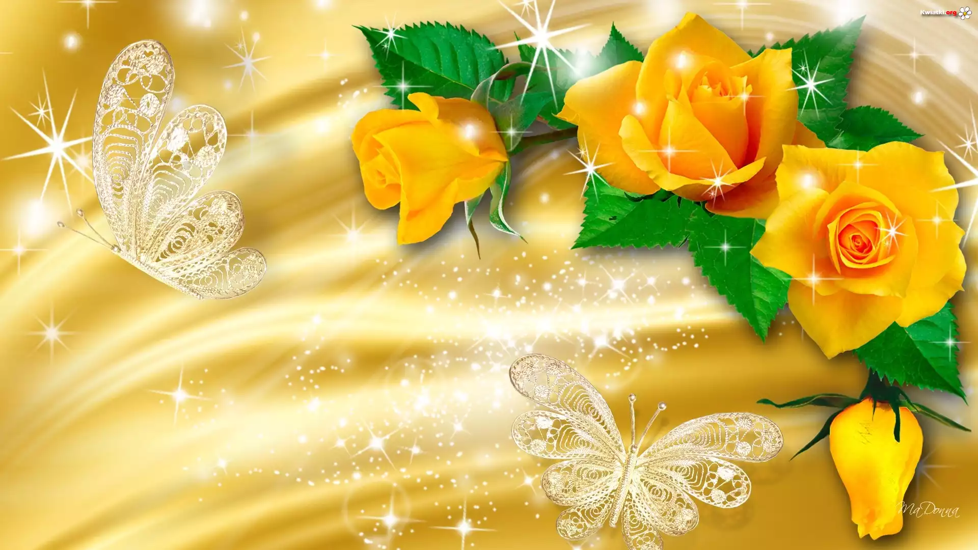 Żółte, Róże, Srebrne, Motyle - Zdjęcia