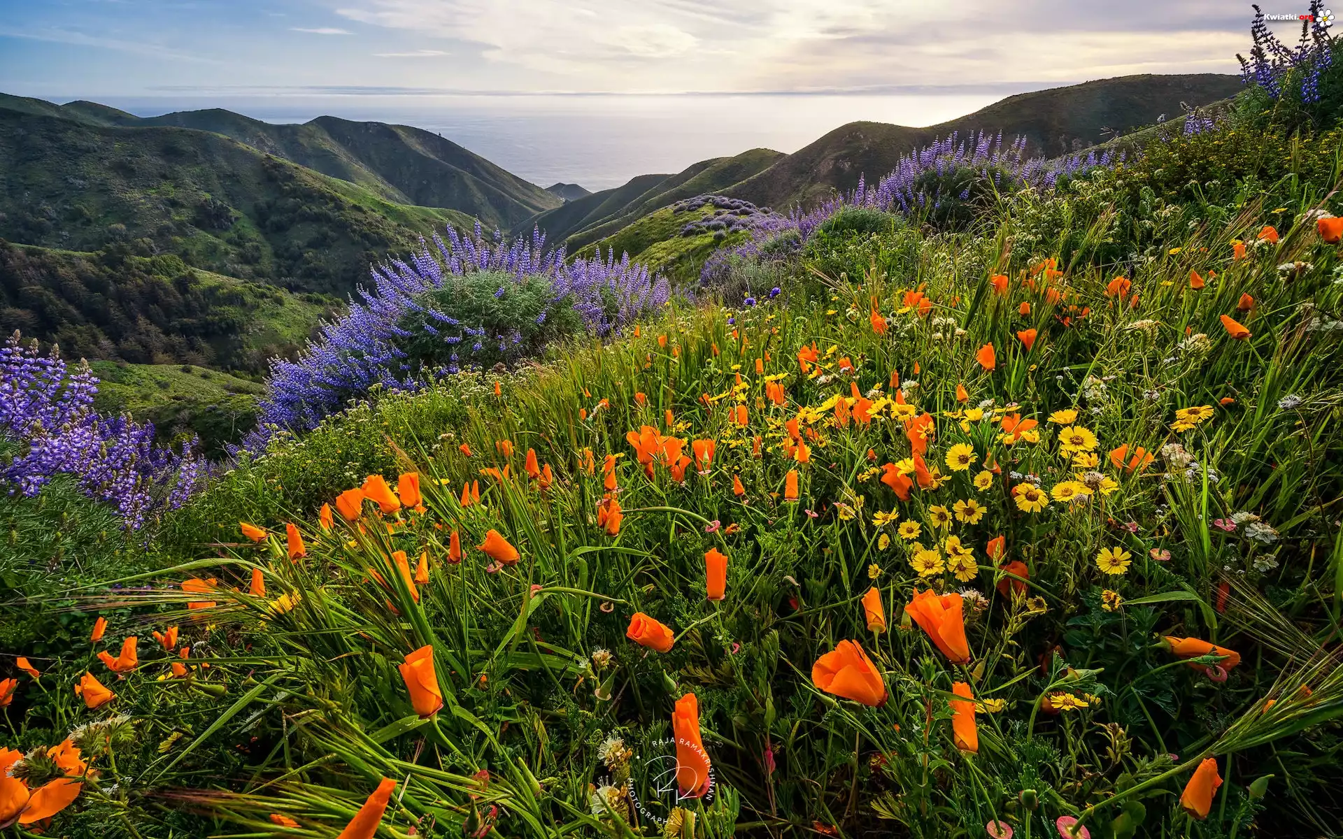 Stany Zjednoczone, Stan Kalifornia, Stanowy Park Garapatta, Sobranes Canyon, Wzgórza, Góry, Kwiaty, Morze, Wybrzeże Big Sur - Zdjęcia |