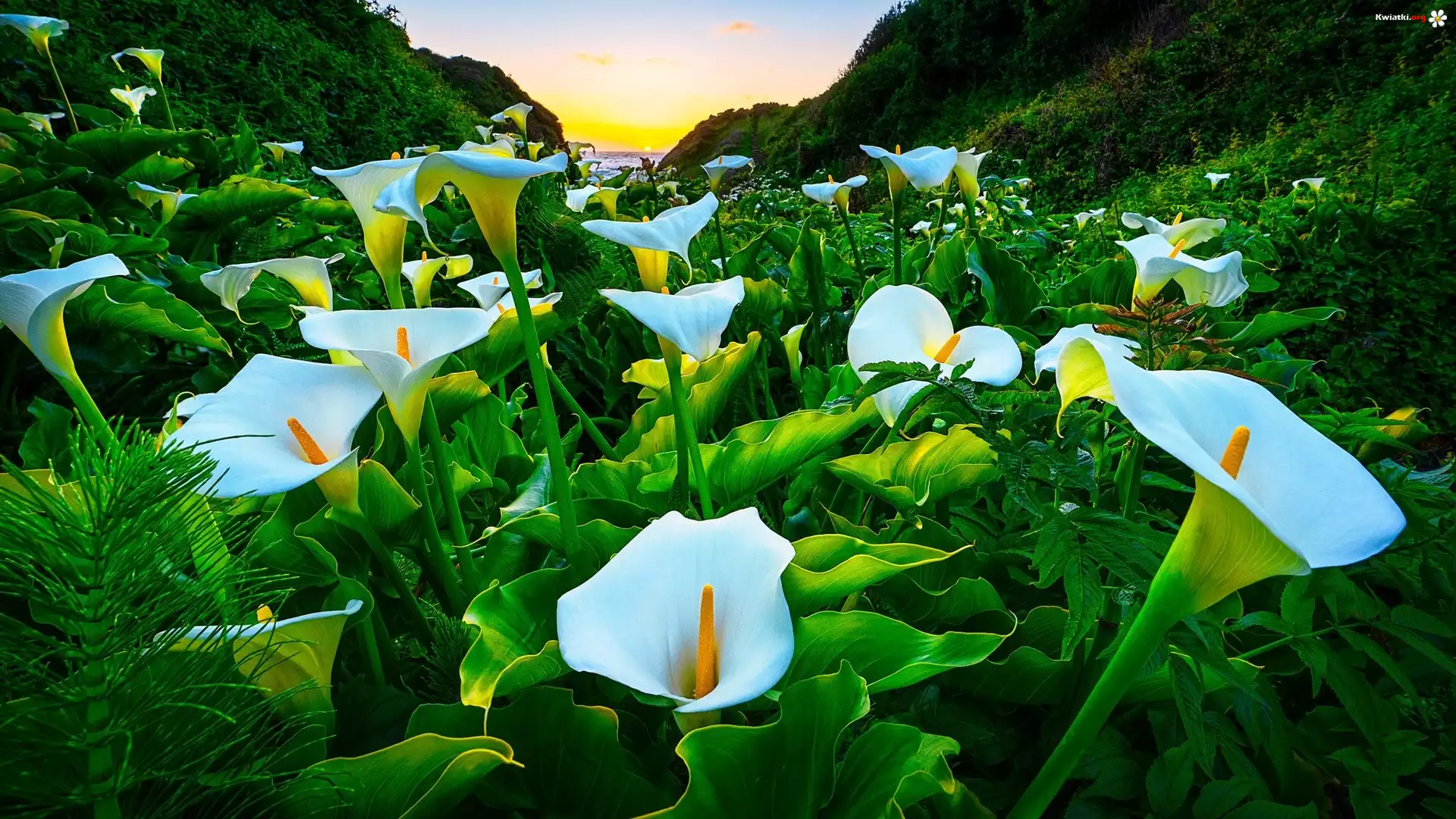Stany Zjednoczone, Kalifornia, Park stanowy Garrapata, Góry, Dolina, Kwiaty, Kalie - Zdjęcia
