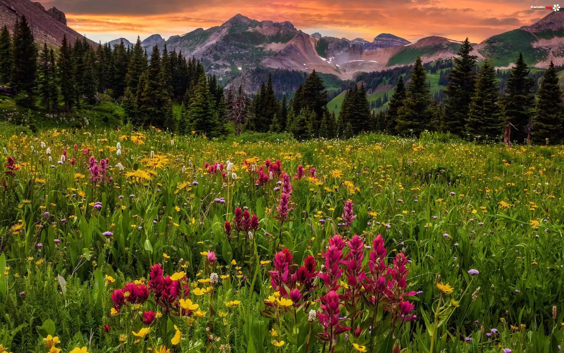 Kwiat Stany Zjednoczone, Kolorado, Góry, Diorite Peak, Łąka, Kwiaty, Drzewa