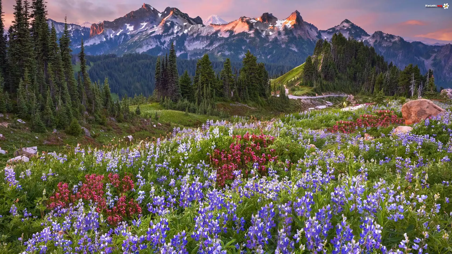 Stany Zjednoczone, Stan Waszyngton, Góry Kaskadowe, Park Narodowy Mount Rainier, Łąka, Łubin, Drzewa - Zdjęcia |