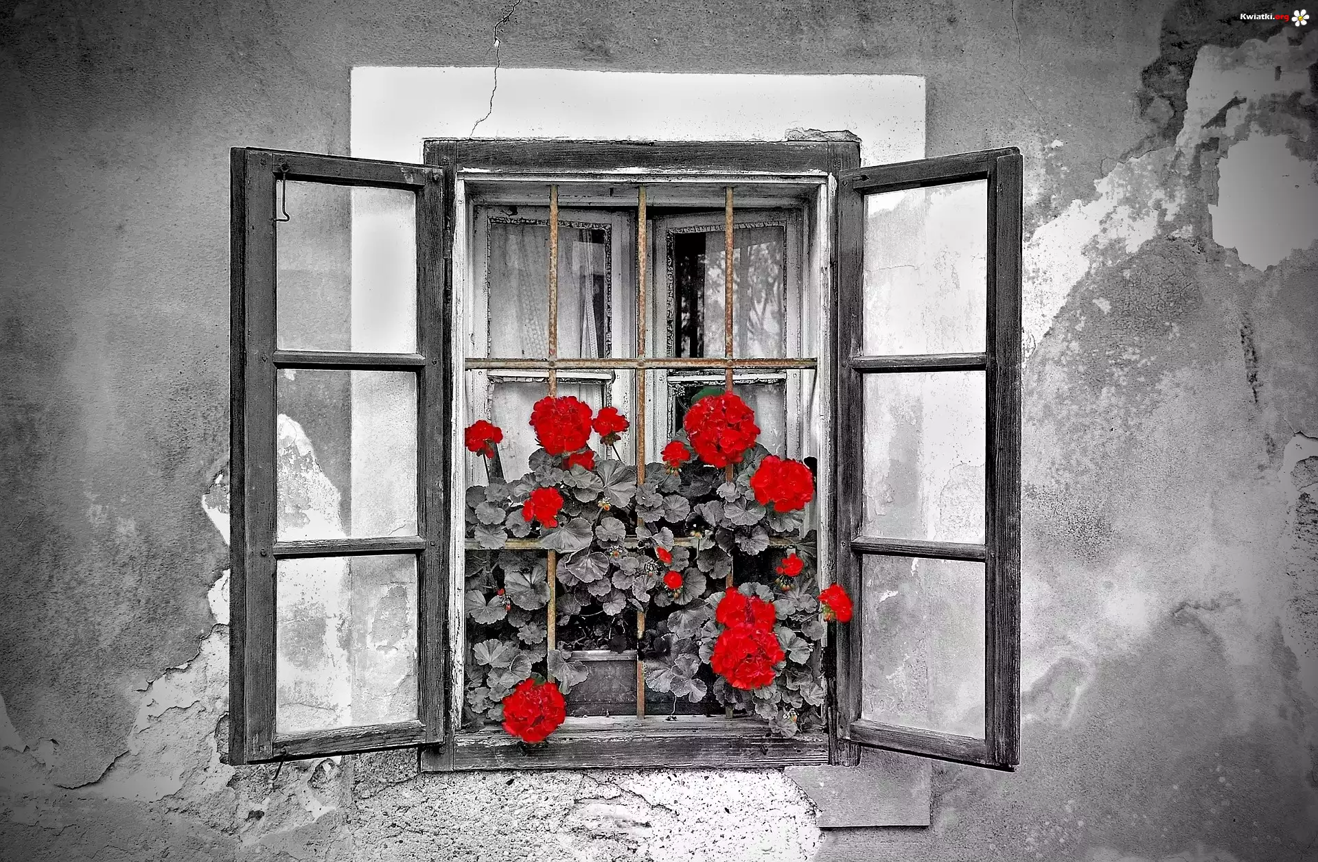 Kwiat Stary, Dom, Okno, Czerwone, Kwiaty