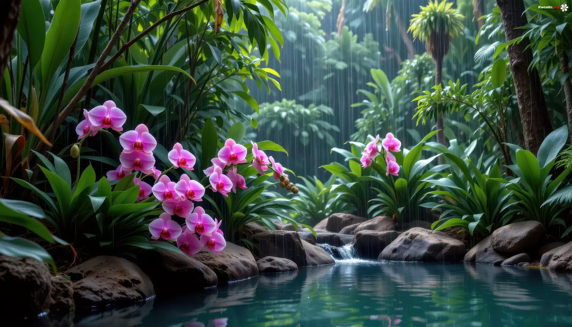 Staw, Kwiaty, Fioletowe, Storczyki, Kamienie, Drzewa, Rośliny, Deszcz, Grafika AI - Zdjęcia