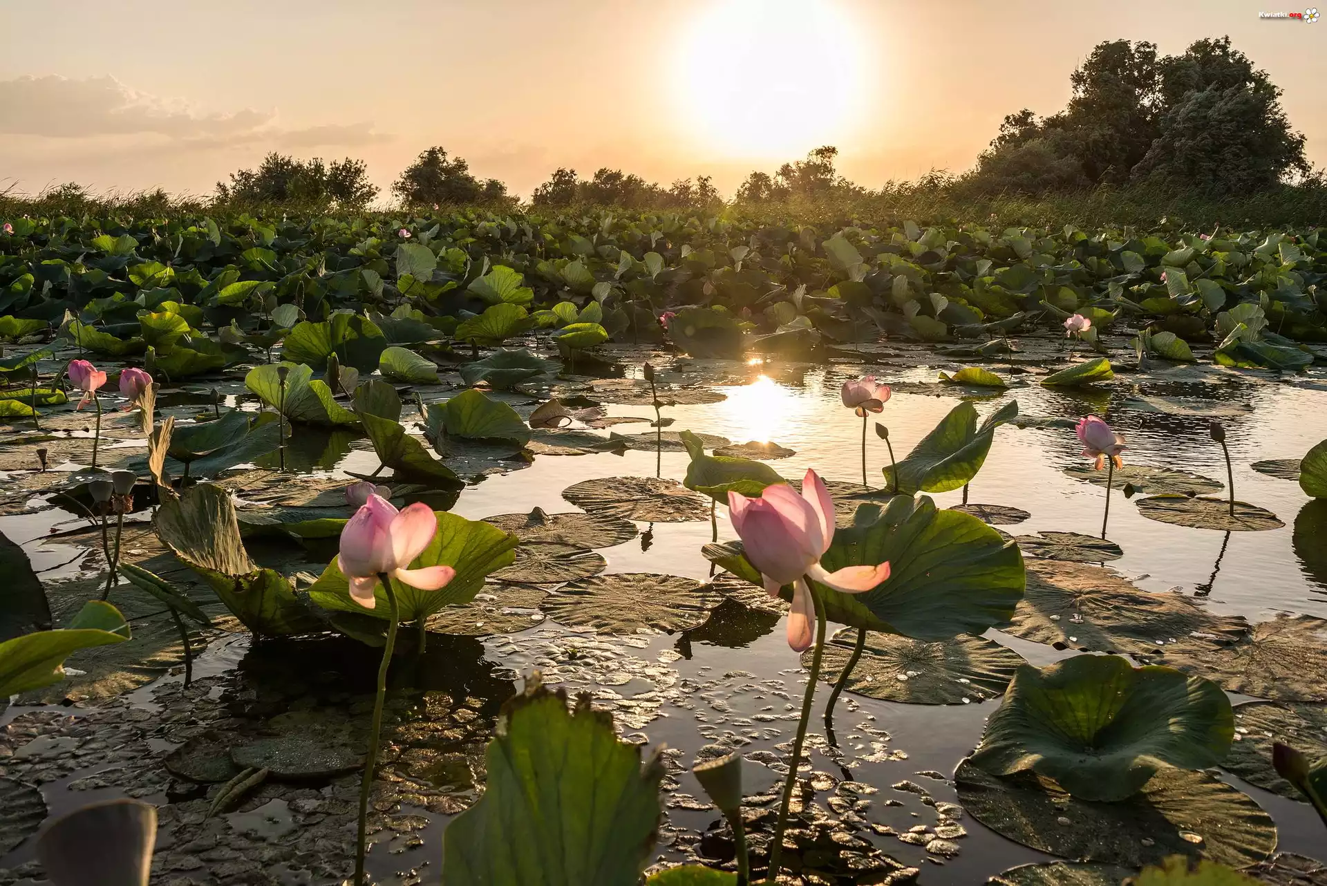 Staw, Kwiaty, Lotosy, Słońce - Zdjęcia