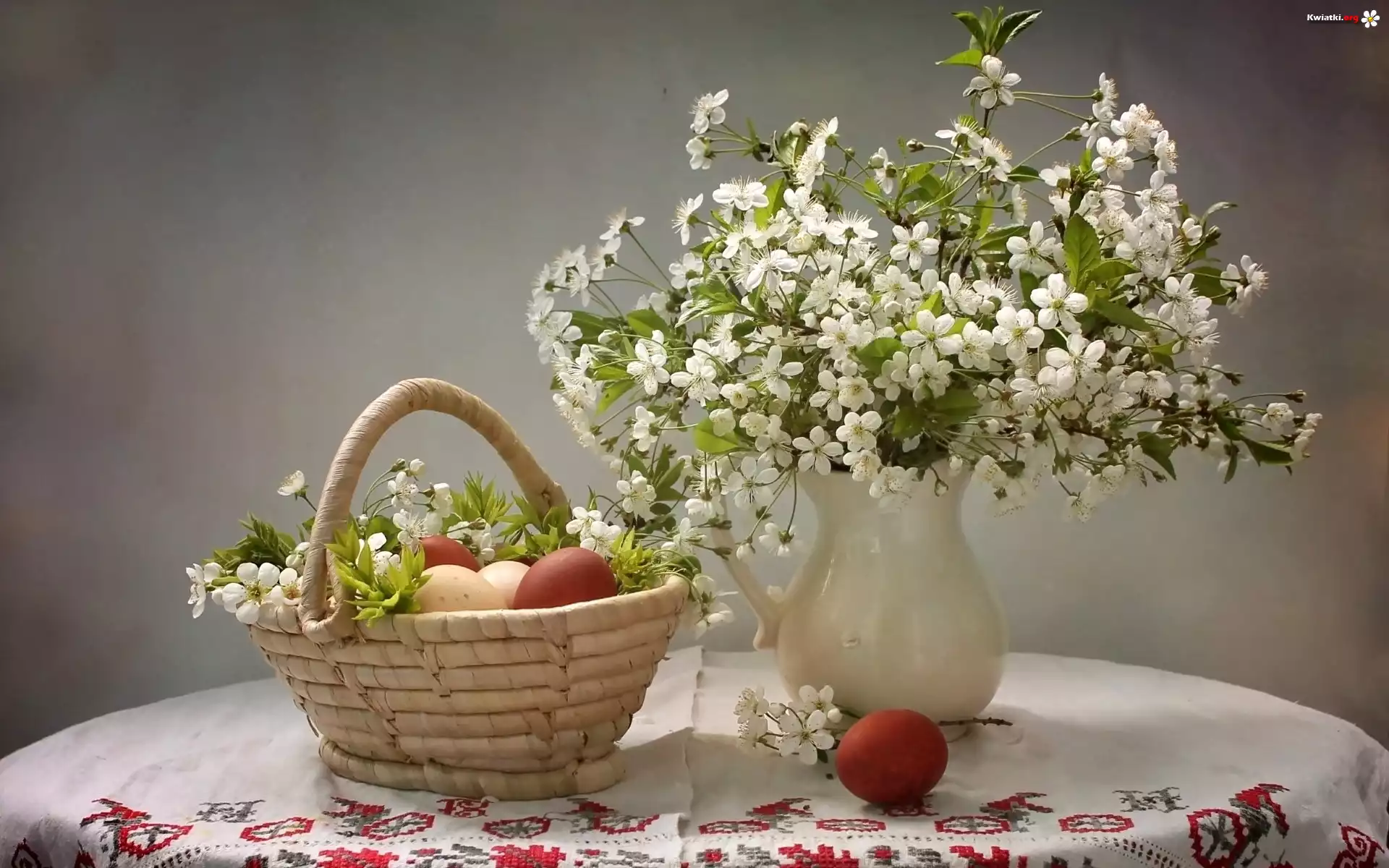 Kwiat Stół, Wazon, Białe, Kwiatki, Kosz, Jajka