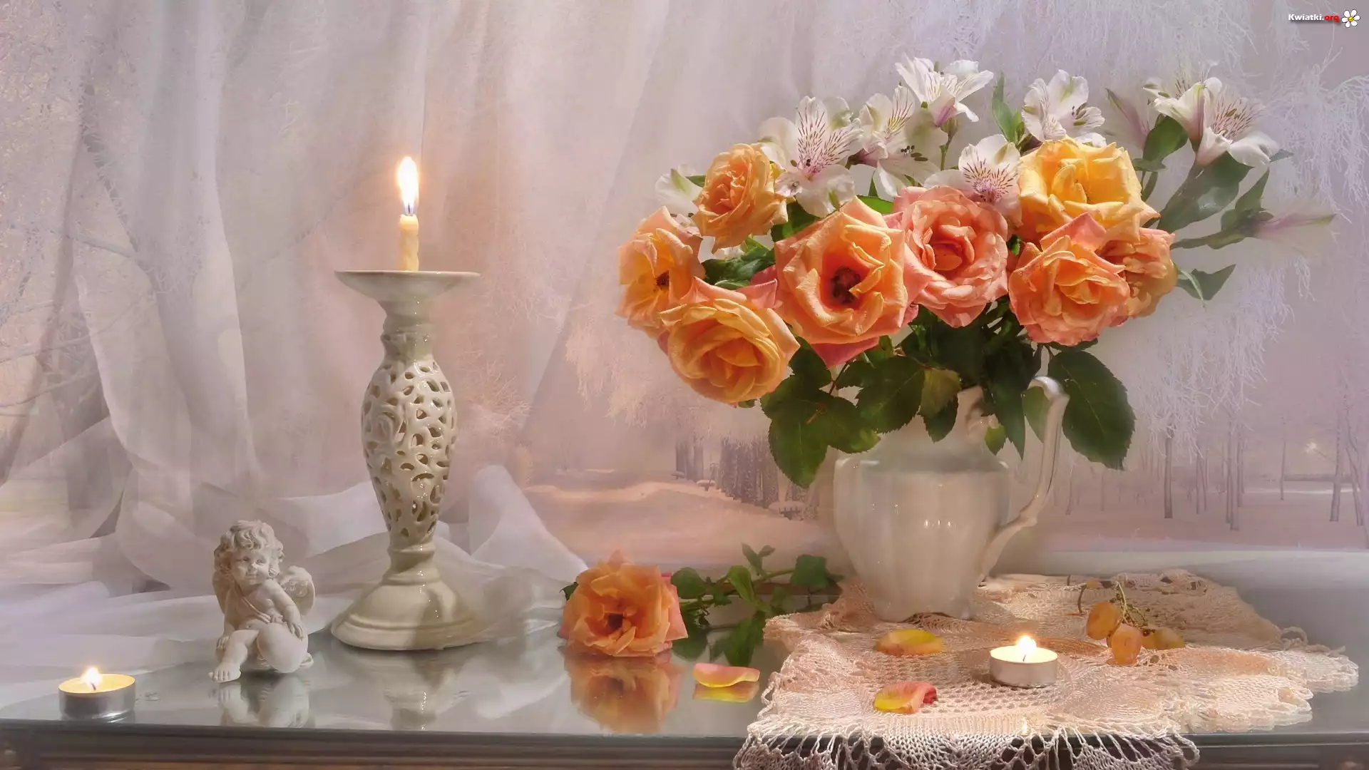 Kompozycja, Kwiaty, Róże, Alstremerie, Wazon, Świeca, Figurka, Aniołek, Stół - Zdjęcia