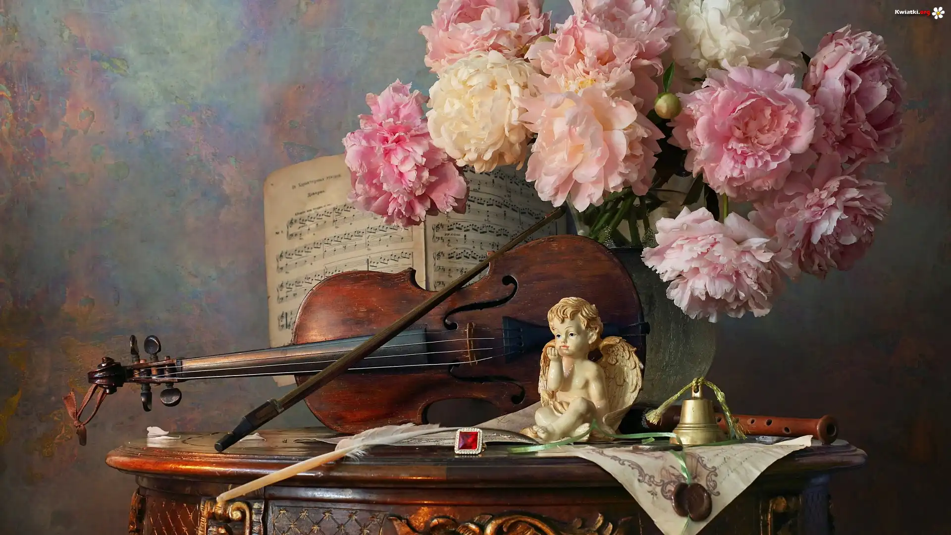 Kwiat Kompozycja, Piwonie, Wazon, Skrzypce, Nuty, Figurka, Aniołek, Flet, Pierścionek, Stolik