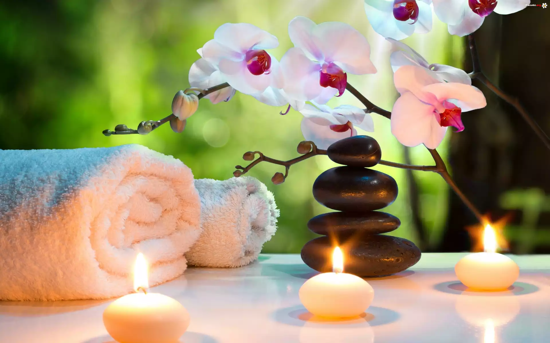 Storczyki, Świece, Kamienie, Ręczniki, SPA, Kompozycja - Zdjęcia