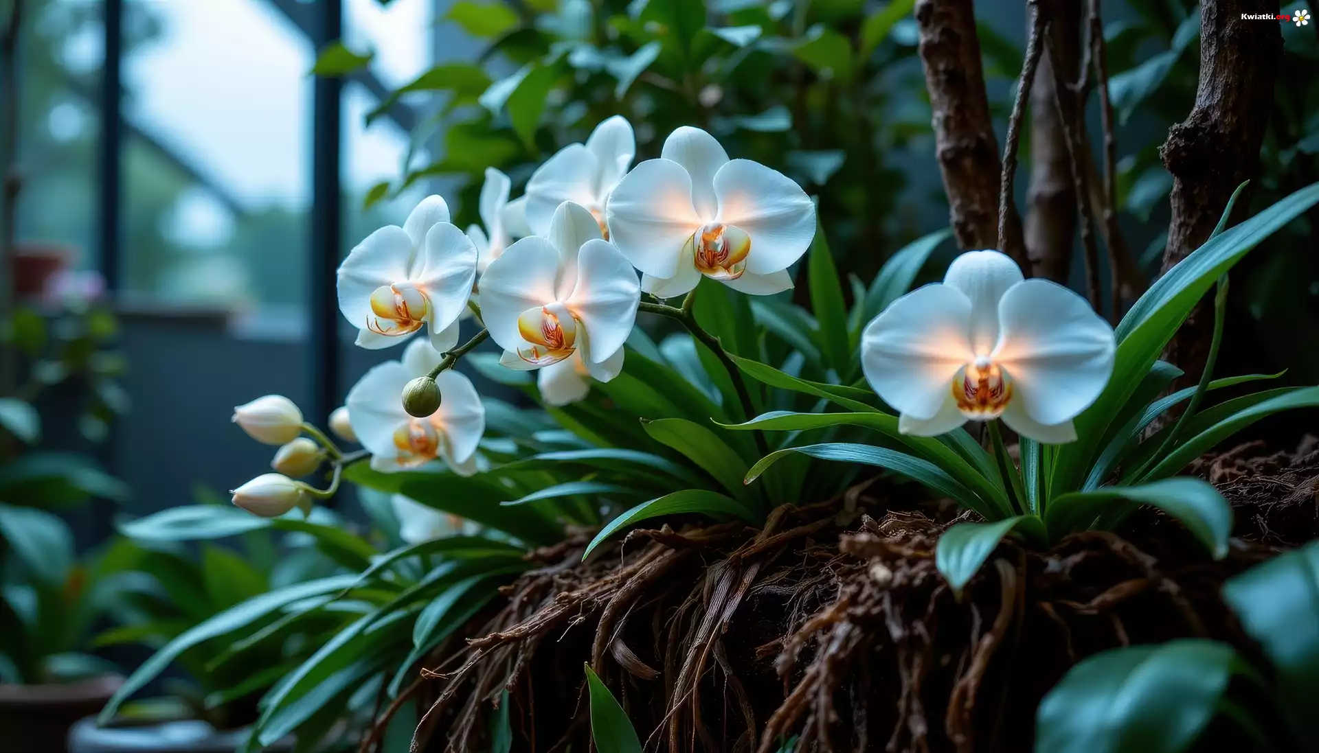 Białe, Storczyki, Rozświetlone, Liście, AI - Zdjęcia