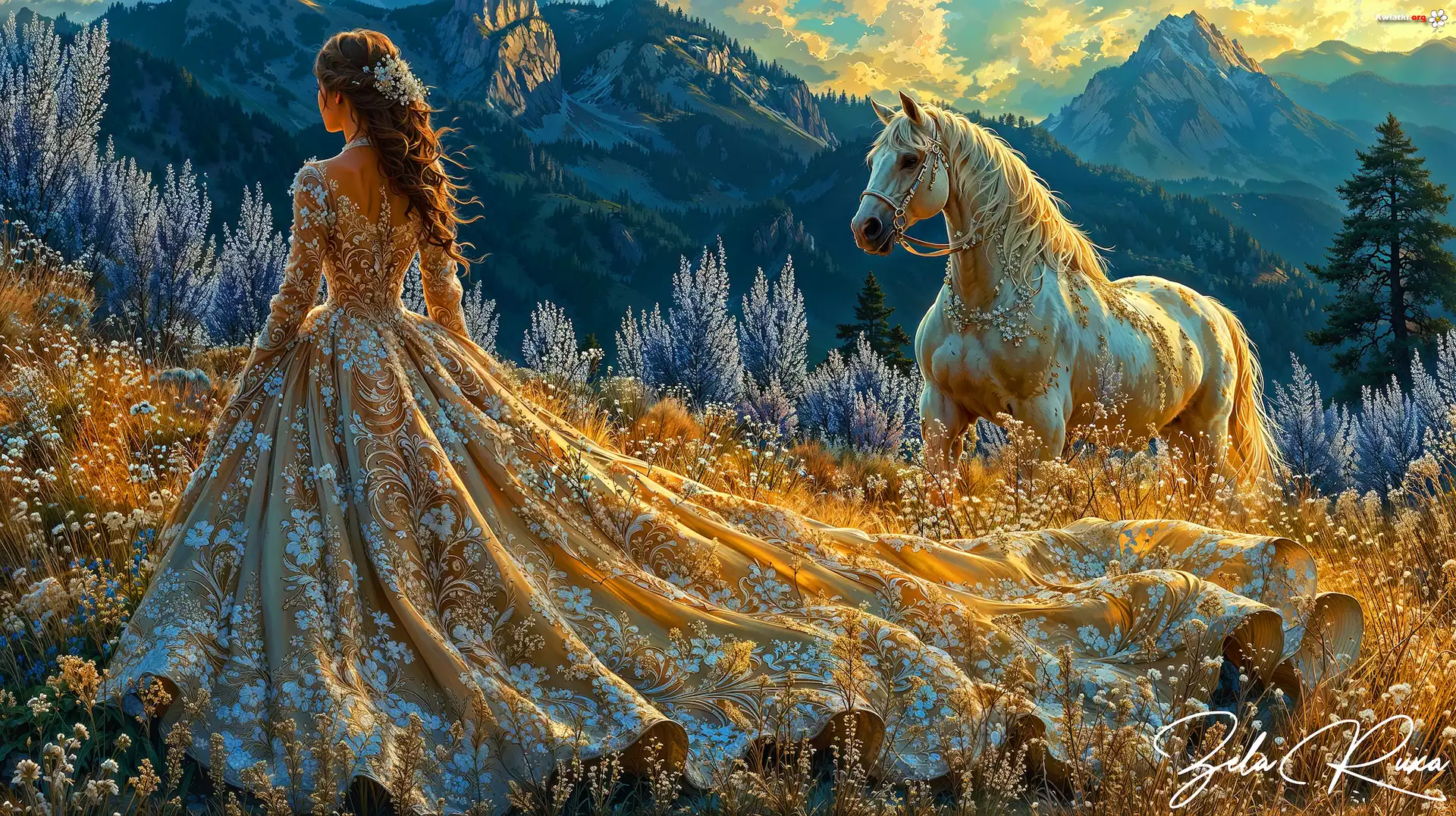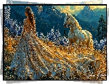 Góry, Polana, Kobieta, Suknia, Kwiaty, Koń, Grafika - Zdjęcia