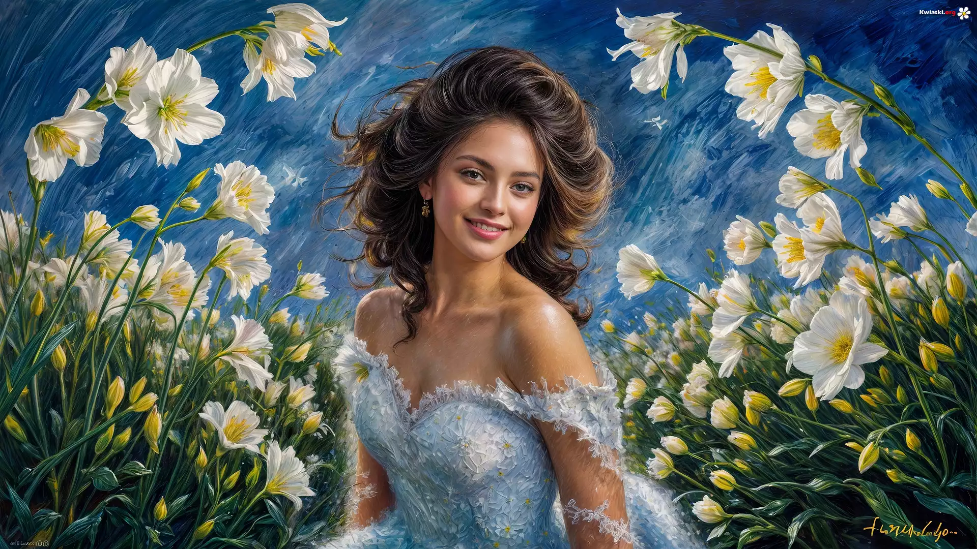 Kobieta, Suknia, Kwiaty, Białe, Grafika - Zdjęcia