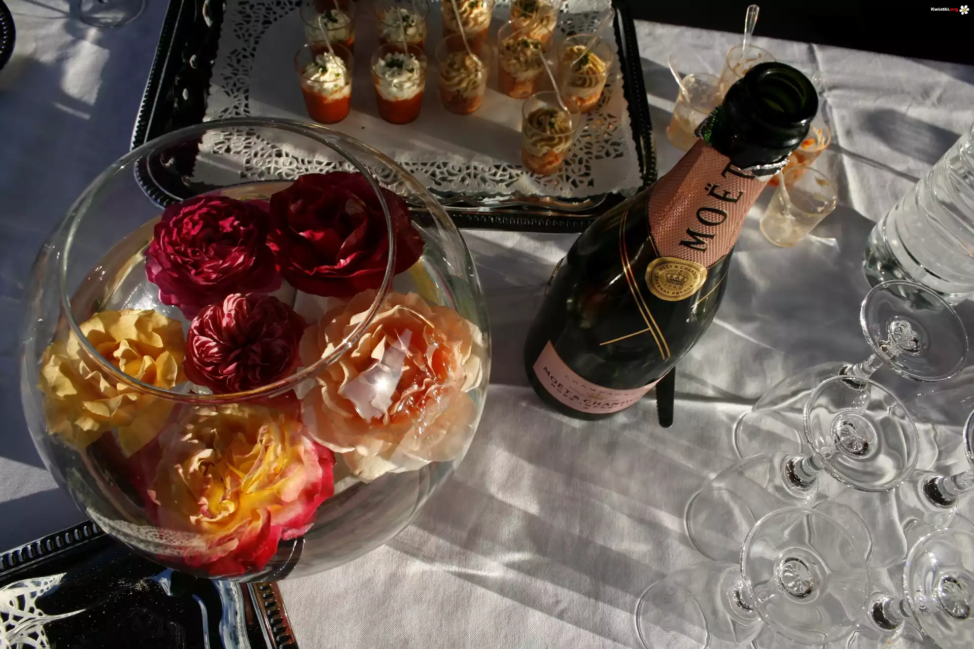 Kwiat Szampan, Kieliszek, Róże, Taca, Deser