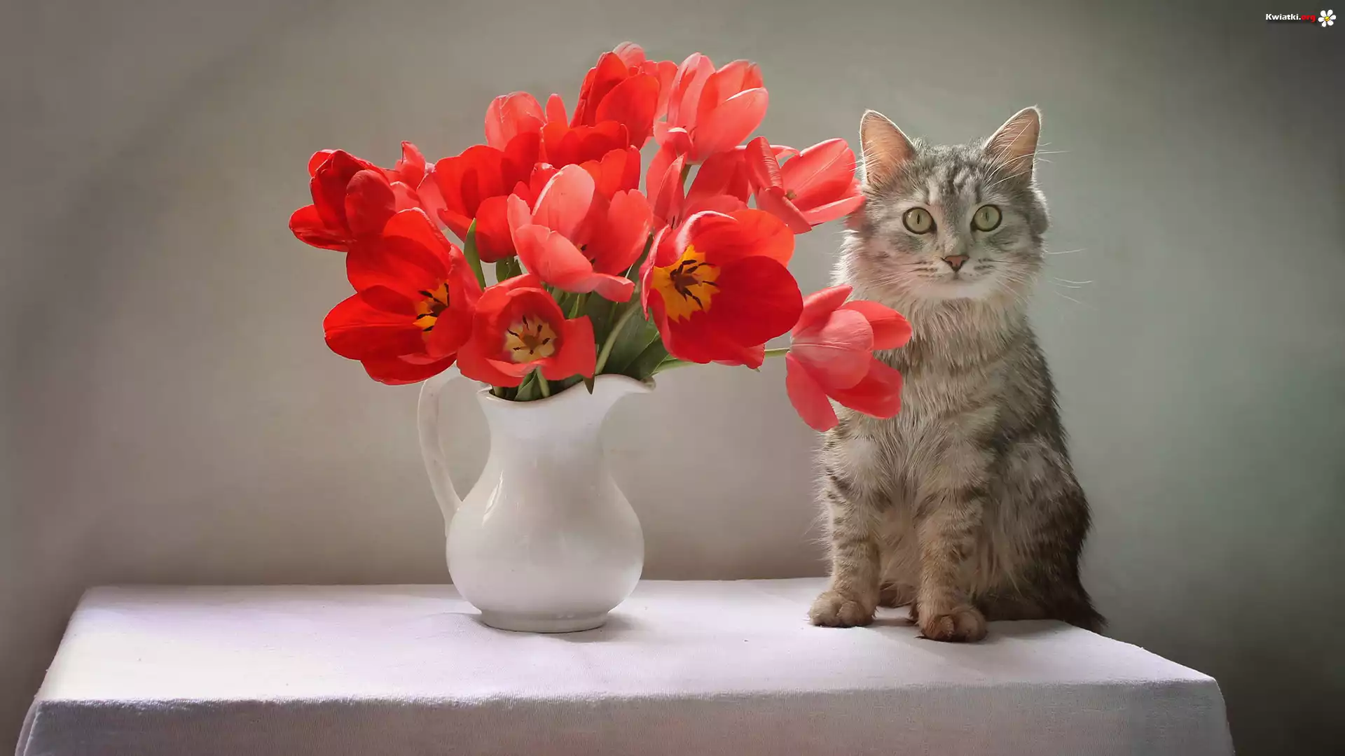 Kwiat Szary, Kot, Bukiet, Czerwone, Tulipany, Wazon