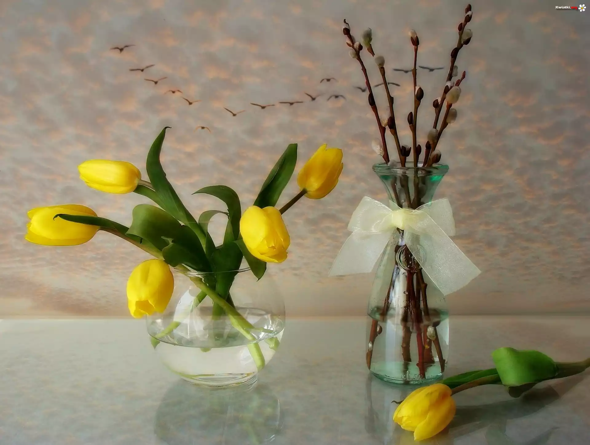 Szklane, Wazony, Żółte, Tulipany, Wstążka, Bazie - Zdjęcia