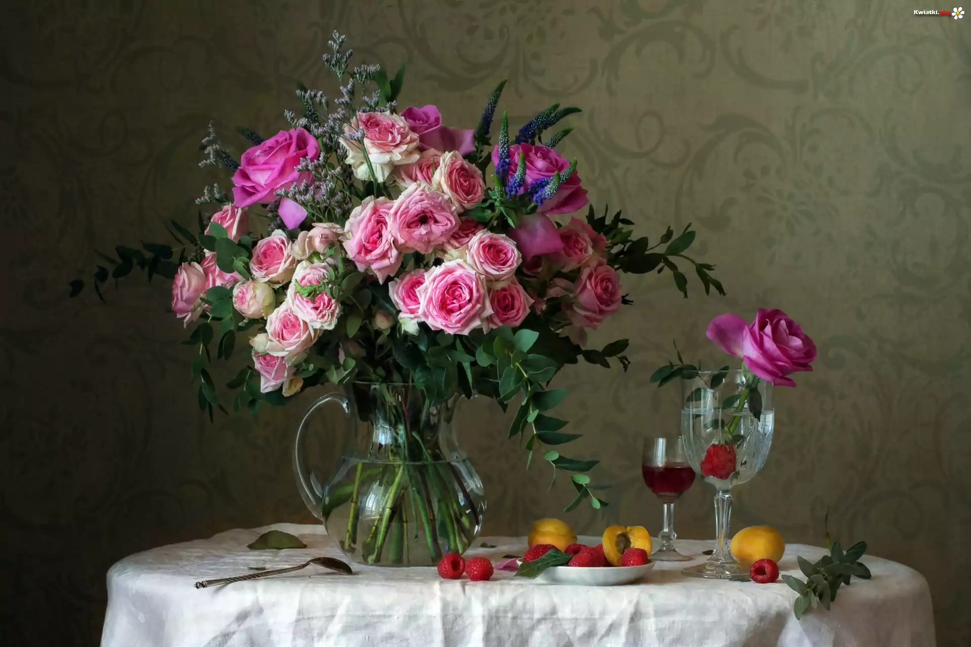 Bukiet, Szklany, Dzbanek, Róże, Kieliszki, Morele, Maliny, Stolik - Zdjęcia