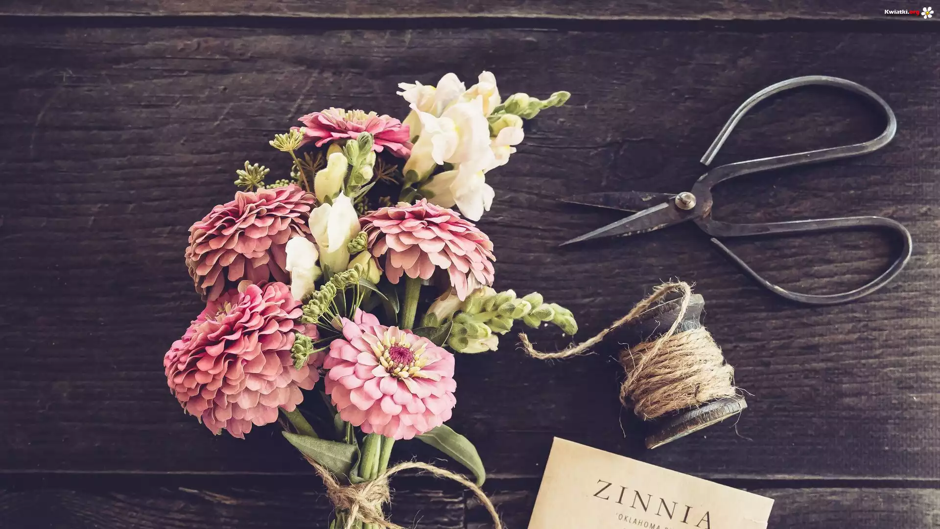 Kwiaty, Cynie, Bukiet, Sznurek, Pocztówka, Nożyczki - Zdjęcia