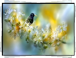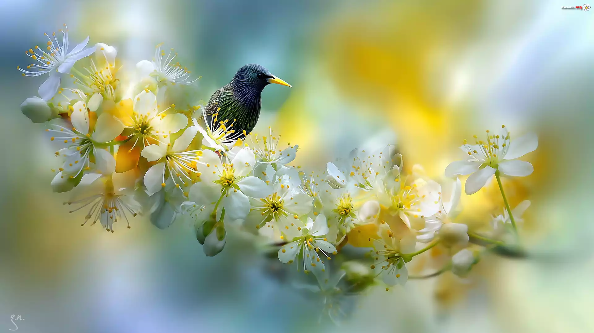 Kwiaty, Drzewo owocowe, Szpak, Ptak, Grafika AI - Zdjęcia