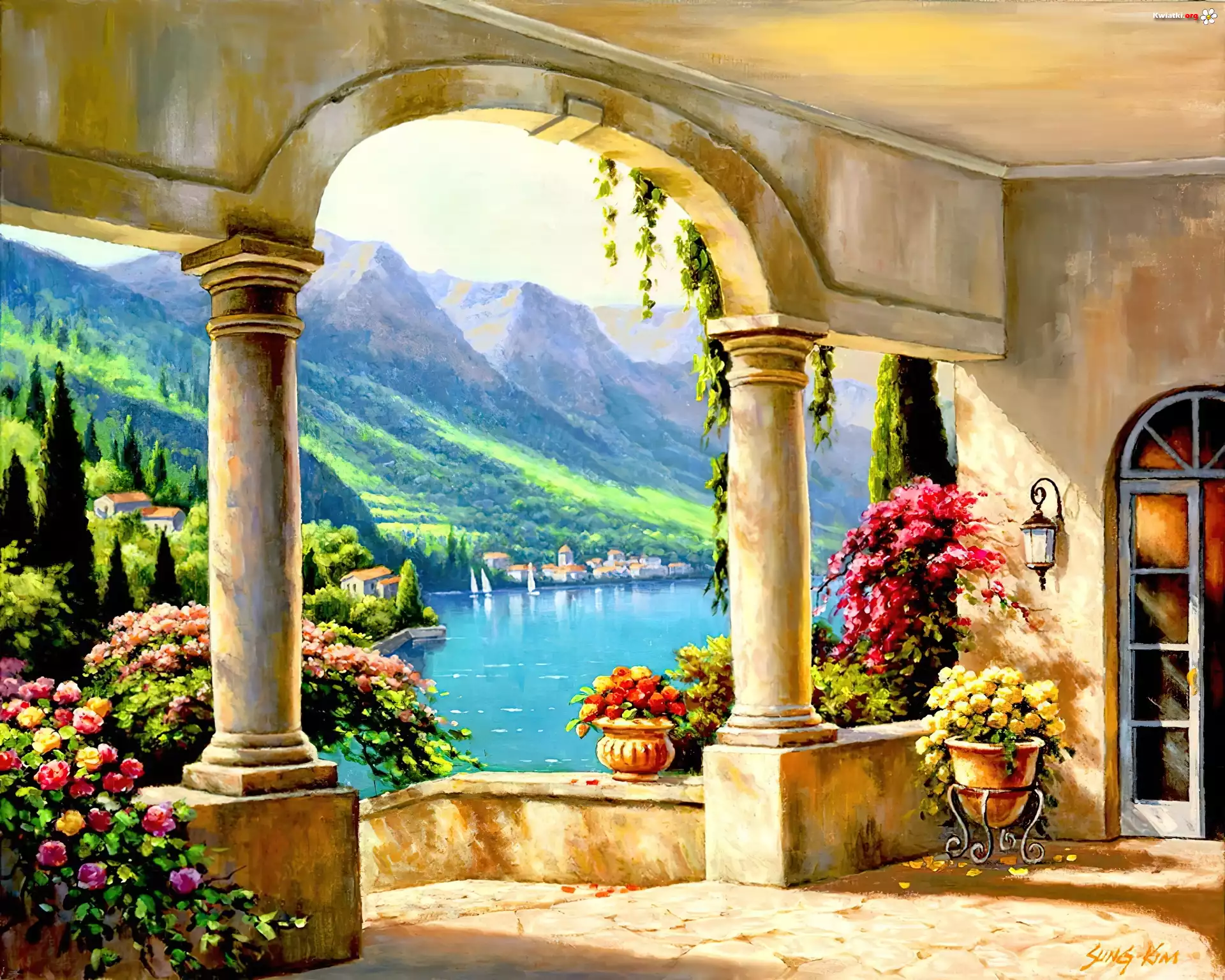 Taras, Widok, Góry, Jezioro, Kolumny, Kwiaty - Zdjęcia