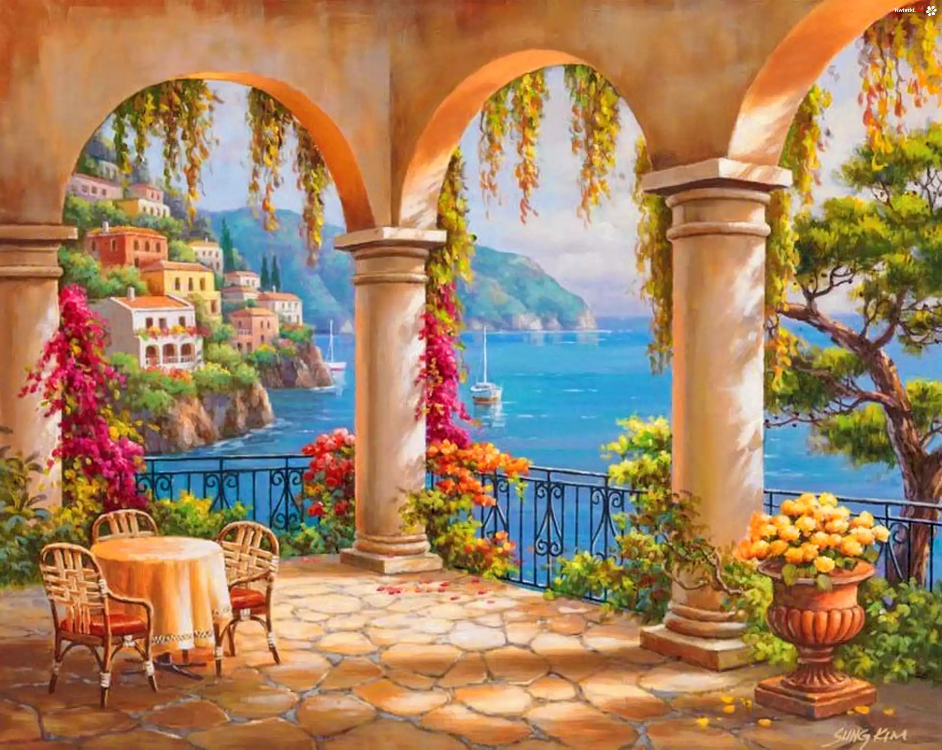 Kwiat Taras, Stolik, Kwiaty, Widok, Na, Morze