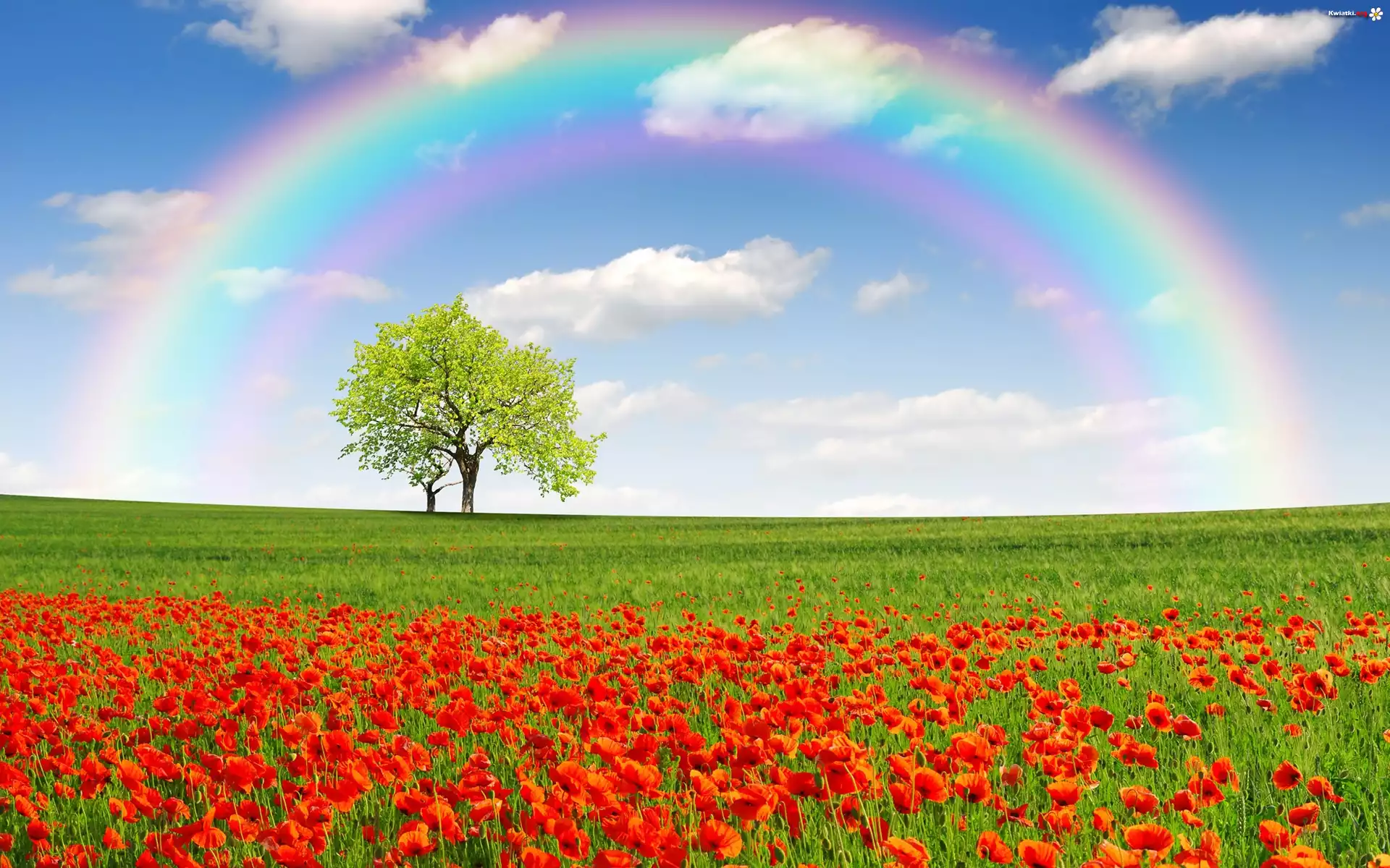 Kwiat Łąka, Maki, Drzewo, Tęcza, Wiosna