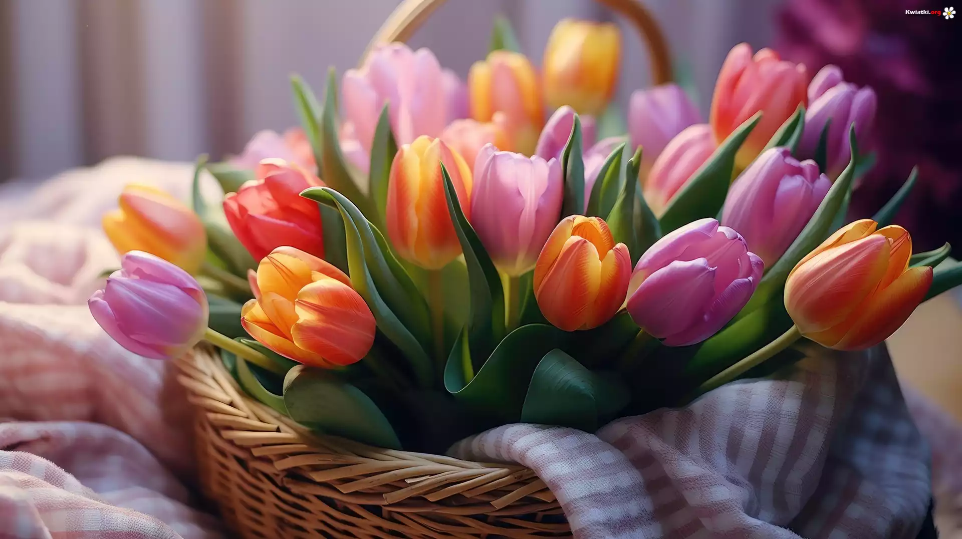Kolorowe, Tulipany, Kosz, Tkanina - Zdjęcia