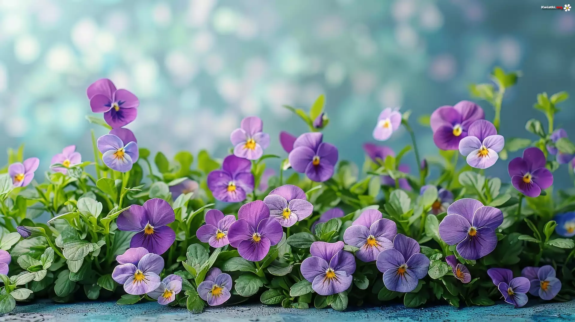 Kwiat Fioletowe, Bratki, Liście, Tło