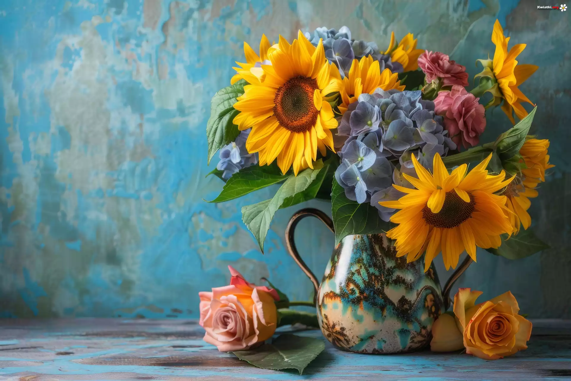 Kwiaty, Bukiet, Hortensje, Róże, Słoneczniki, Dzbanek, Deski, Tło - Zdjęcia