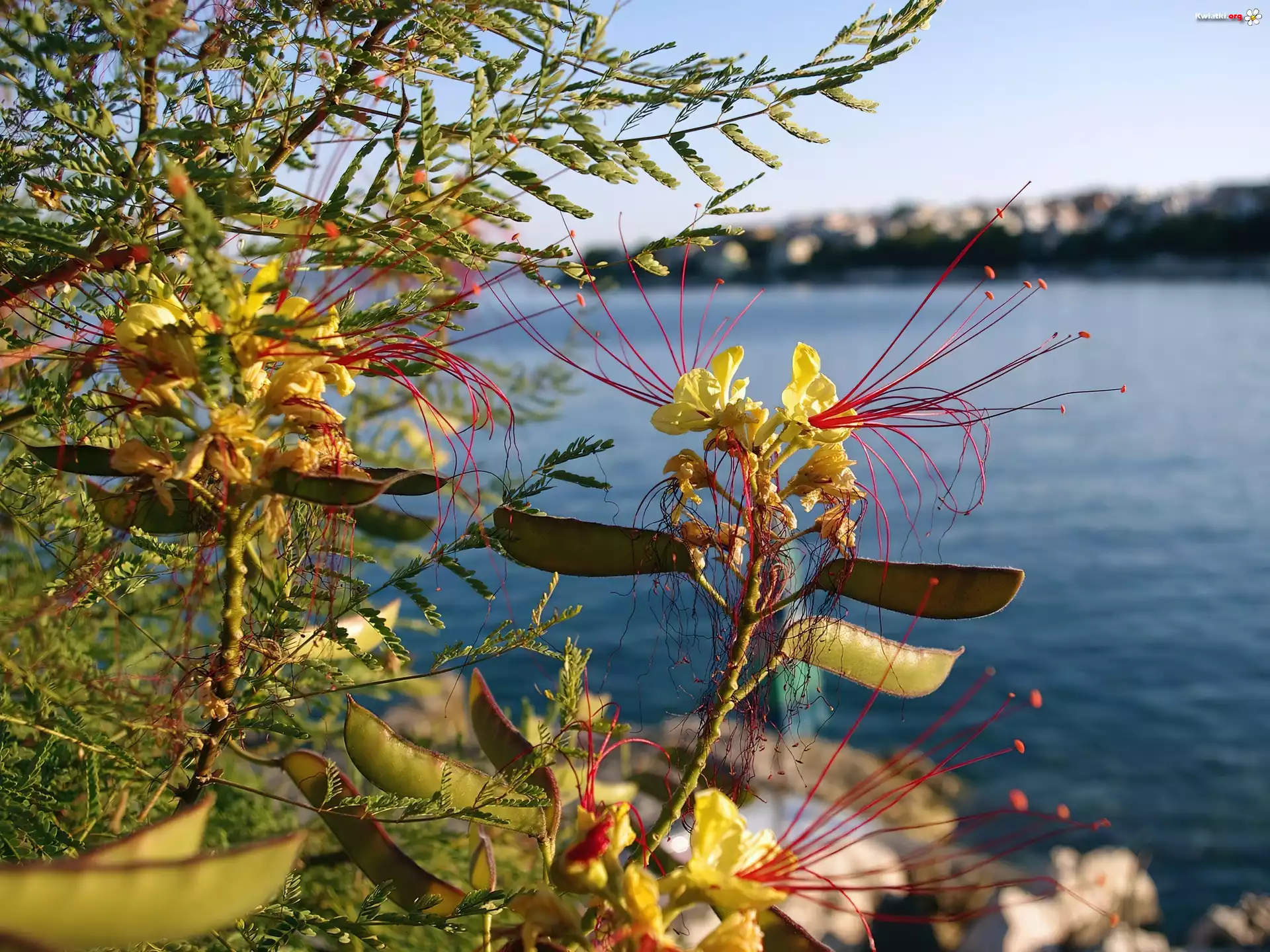 Żółte, Kwiaty, Strąki, Tło, Woda - Zdjęcia